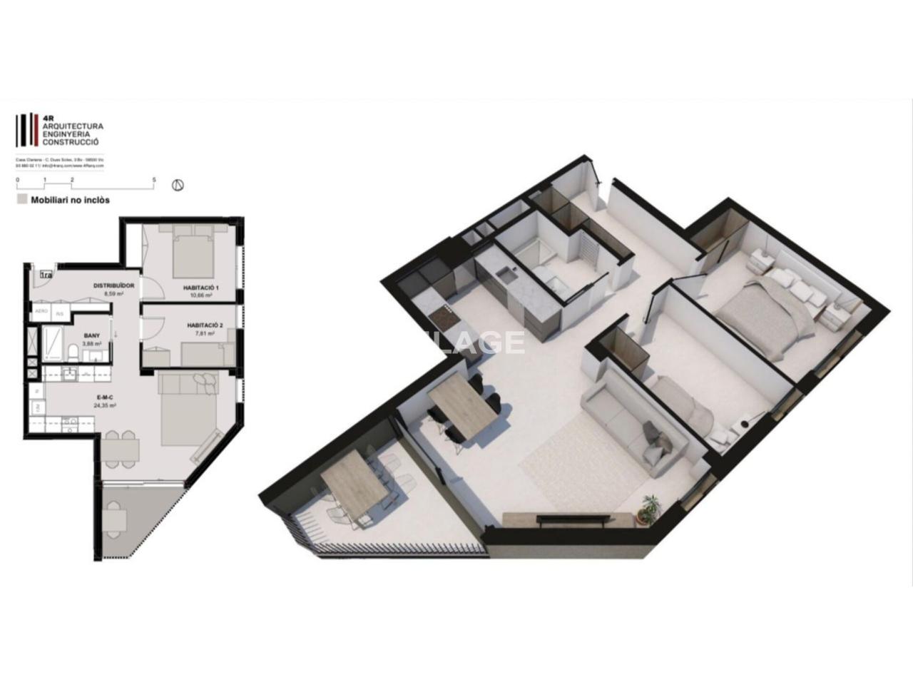 Altura pis 1r, pis superfície construïda 64,3 m², sup. útil 55,29 m², núm. hab. individ.: 1, habitacions dobles: 1, 1 bany/s, adaptat a persones amb discapacitat, ascensor, balcó (5.33), calefacció (aerotermia), fusteria exterior (pvc), cuina, estat conservació: a estrenar, núm. veïns per planta: 4, orientació sud-oest, porter auto., porta blind., assolellat, vidres dobles, exterior.